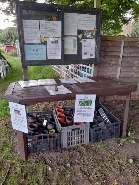 There are now two Communal Tables donated and setup by keen volunteers (with our thanks) . They are located under the notice board near the entrances of both Foxes Piece and Hanging Hill. The tables enable tenants to leave surplus crop & seedlings etc for others to share.