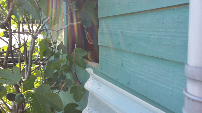 Here is the photo of a Robin Redbreast chick the parents have nested in a shed (in a carried bag) at Hanging Hill. The fledgling has just popped onto the ledge to see the Big Wide World!