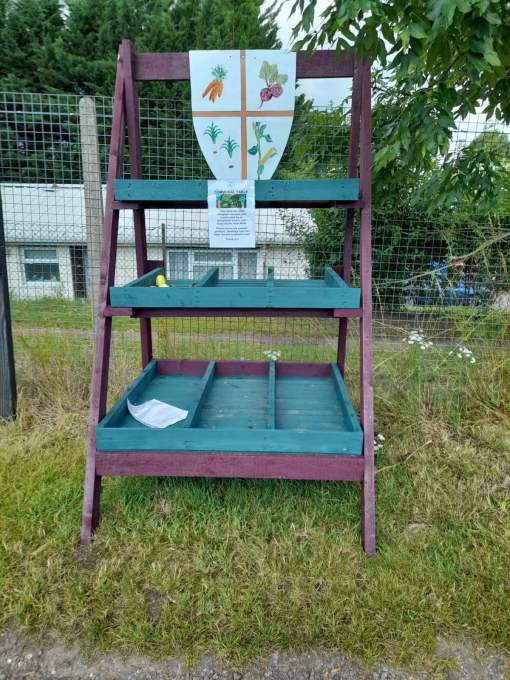 There are now two Communal Tables donated and setup by keen volunteers (with our thanks) . They are located under the notice board near the entrances of both Foxes Piece and Hanging Hill. The tables enable tenants to leave surplus crop & seedlings etc for others to share.
